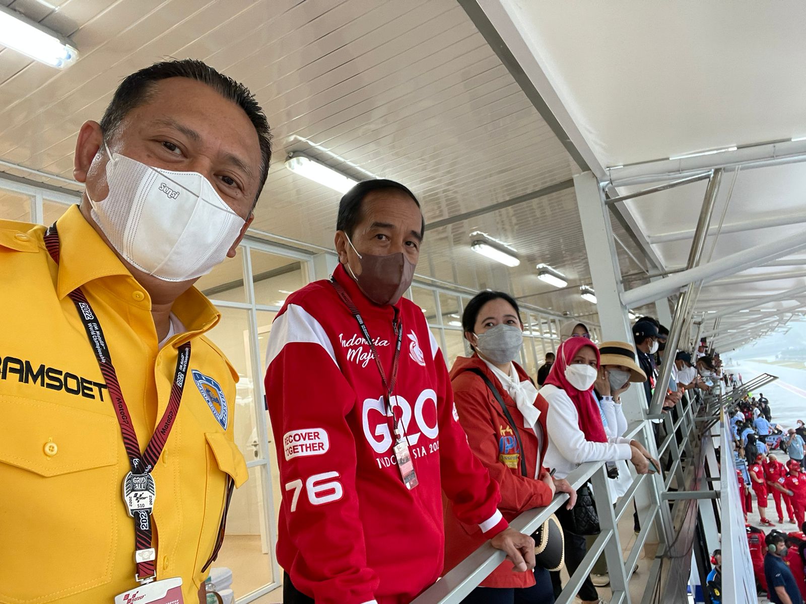 LOMBOK – Ketua MPR RI sekaligus Ketua Umum Ikatan Motor Indonesia (IMI) Bambang Soesatyo mendampingi Presiden Joko Widodo dan Ibu Negara Iriana Joko Widodo, serta Ketua DPR RI Puan Maharani menyaksikan secara langsung kejuaraan MotoGP di Pertamina Mandalika International Street Circuit, Lombok, Nusa Tenggara Barat (NTB). Dirinya bersyukur, berkat kerja keras pemerintahan Presiden Joko Widodo, penyelenggaraan MotoGP yang sudah dinantikan selama 25 tahun, akhirnya bisa sukses terselenggara. Indonesia telah menjadi tuan rumah yang sangat baik dan memberikan kesan mendalam bagi para pembalap dan crew yang datang.