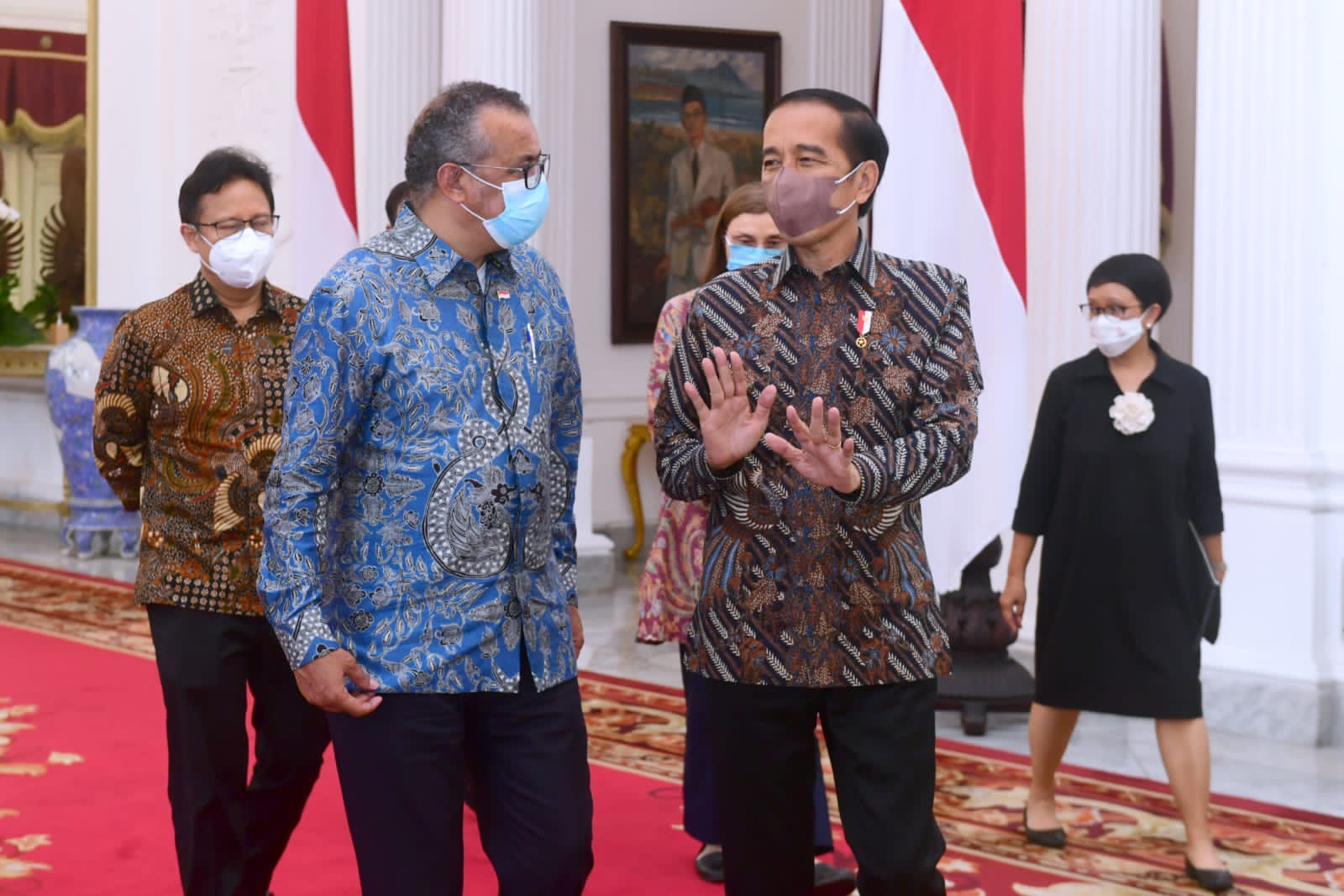 Presiden Joko Widodo menerima kunjungan kehormatan Direktur Jenderal Organisasi Kesehatan Dunia (WHO) Tedros Adhanom Ghebreyesus di Istana Merdeka, Jakarta, pada Selasa, 21 Juni 2022. Menteri Luar Negeri Retno Marsudi yang turut mendampingi Presiden Jokowi dalam pertemuan tersebut mengatakan bahwa Dirjen WHO menyampaikan apresiasi kepada Indonesia dalam kepemimpinannya di G20.