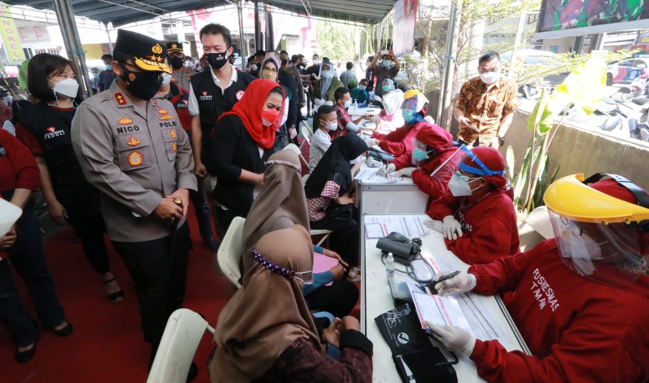 Surabaya – Kapolda Jawa Timur Irjen Pol Dr Nico Afinta Karo-Karo, S.I.K., S.H., M.H., bersama Pejabat Utama Polda Jatim, Sabtu (28/8/2021) melakukan pengecekan serbuan vaksinasi Merdeka, yang berlangsung di Wage Sidoarjo dan Mapolres Mojokerto Kabupaten. Masing-masing menyiapkan sebanyak 1000 dosis baik tahap satu maupun tahap dua.