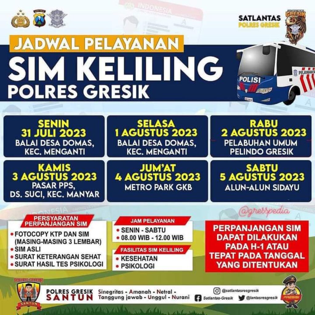 Bagi anda warga Gresik Jawa Timur yang ingin melakukan perpanjangan SIM anda dapat melakukan perpanjangan di SIM Keliling Satlantas Polres Gresik.