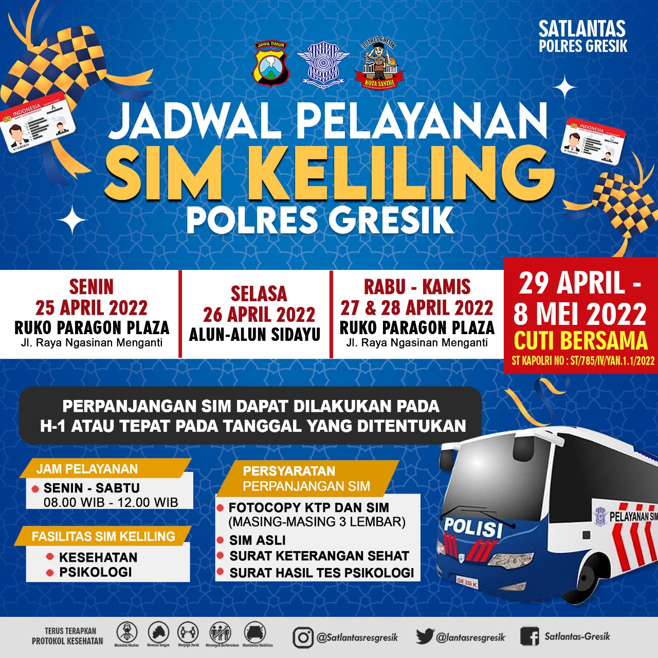 Dalam kondisi masih mewabahnya Covid-19, bagi anda warga Gresik Jawa Timur yang ingin melakukan perpanjangan SIM anda dapat melakukan perpanjangan di SIM Keliling Satlantas Polres Gresik.