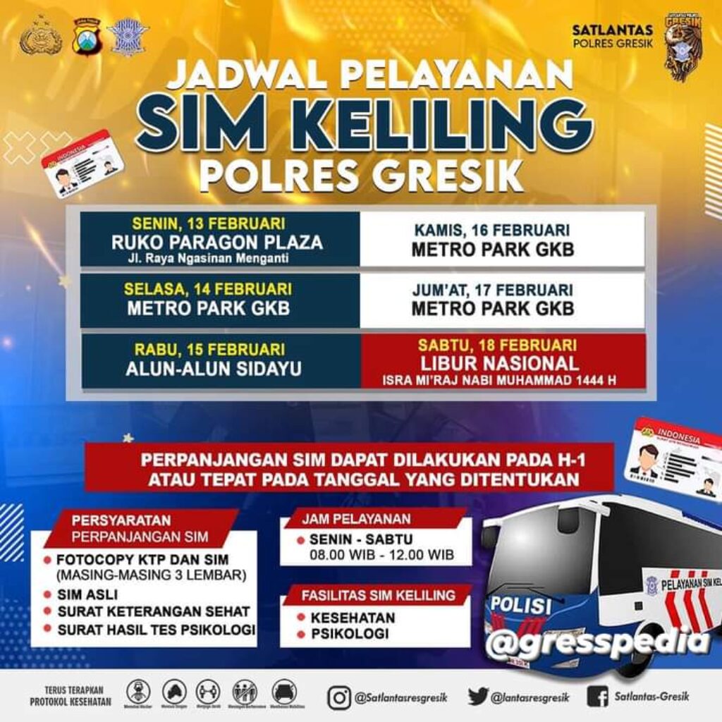 Lokasi Pelayanan SIM Keliling Gresik diadakan pada hari Senin 13 Februari 2023 Ruko Paragon Plaza, 14,16,17 Februari 2023 di Metro Park Gkb.