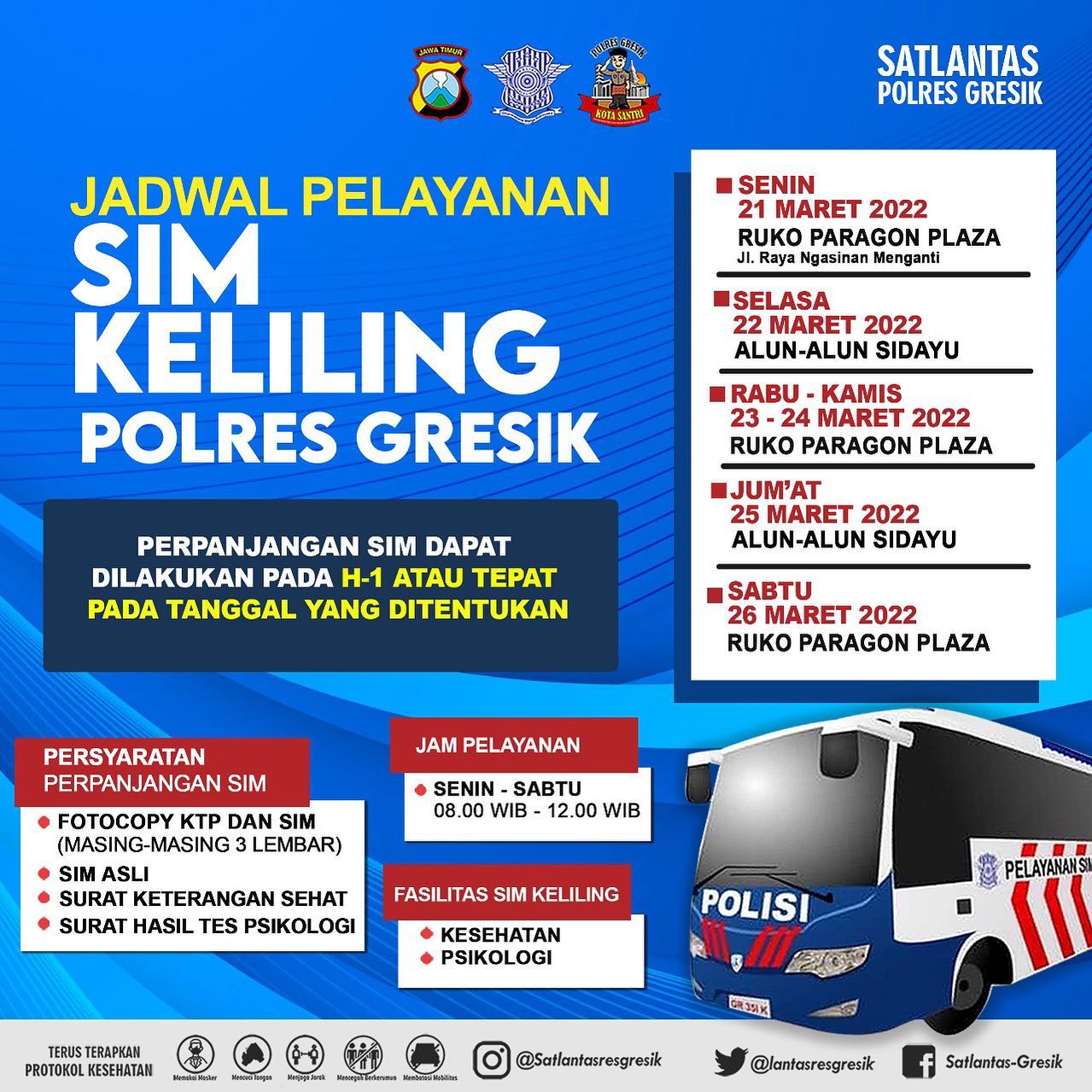 Dalam kondisi masih mewabahnya Covid-19, bagi anda warga Gresik Jawa Timur yang ingin melakukan perpanjangan SIM anda dapat melakukan perpanjangan di SIM Keliling Satlantas Polres Gresik.