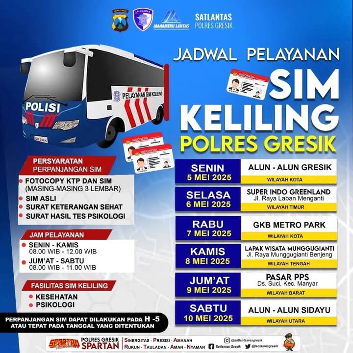 Lokasi Pelayanan Sim Keliling Gresik pada: 5 Mei di Alun-Alun Gresik, 6 Mei di Superindo Menganti, 10 Mei Alun-Alun Sidayu, 7 Mei Metropark GKB, 9 Mei Pasar PPS.