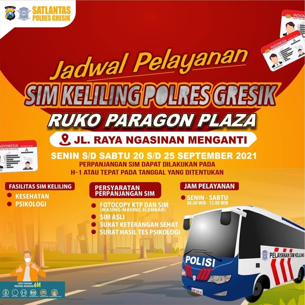 Lokasi Pelayanan SIM Keliling Gresik diadakan di Menganti (Ruko Paragon Plaza) , pada hari Senin S/D Sabtu tanggal 20-25 September 2021.