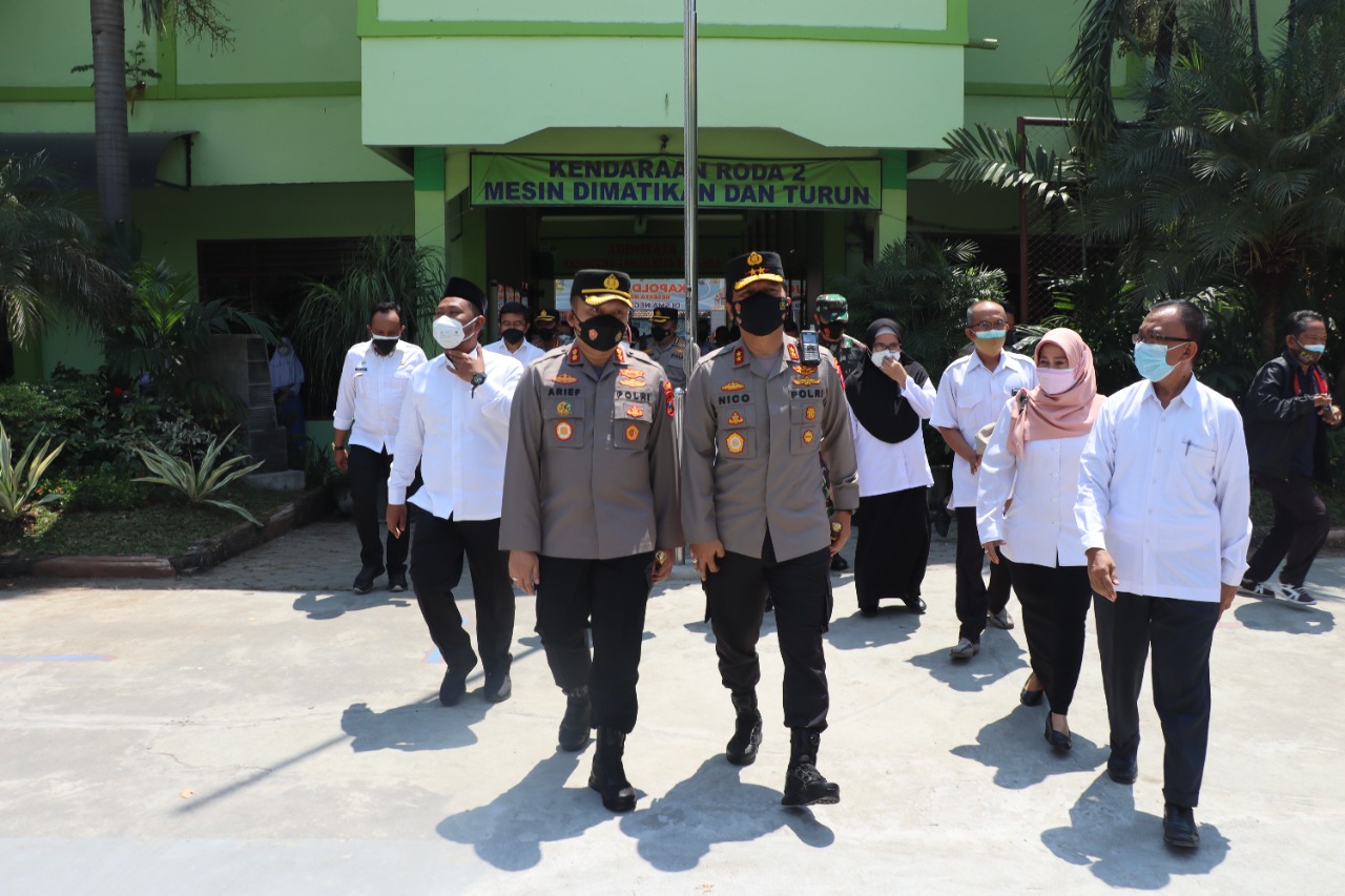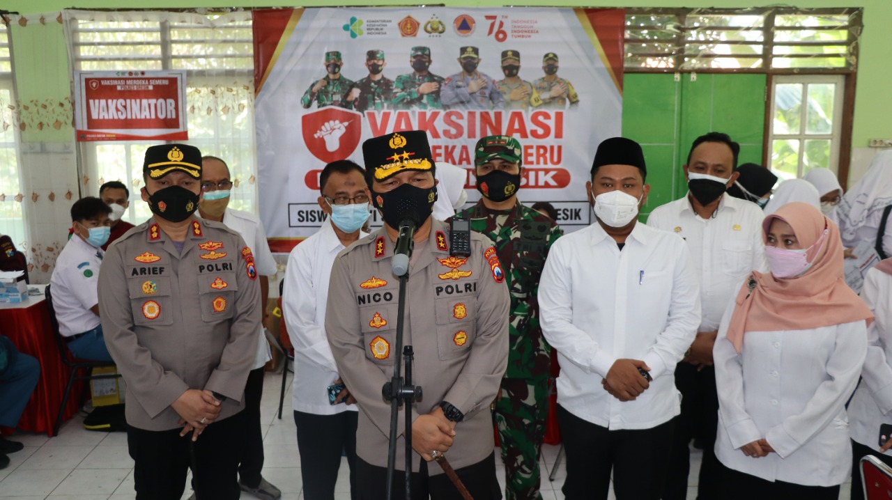 Gresspedia – Kapolda Jawa Timur Irjen Pol Nico Afinta meninjau vaksinasi di SMA Negeri 1 Gresik. Sebanyak 1.249 pelajar di SMA favorit ini menerima dosis vaksin Sinovac, Rabu (1/9/2021).