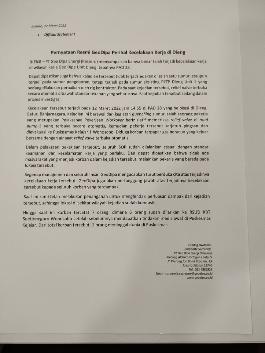 Peristiwa bocornya gas sumur bor Geo Dipa di wilayah Dieng, Banjarnegara, Jawa Tengah pada Sabtu (12/3/2022) mengakibatkan sejumlah orang dilarikan ke rumah sakit.