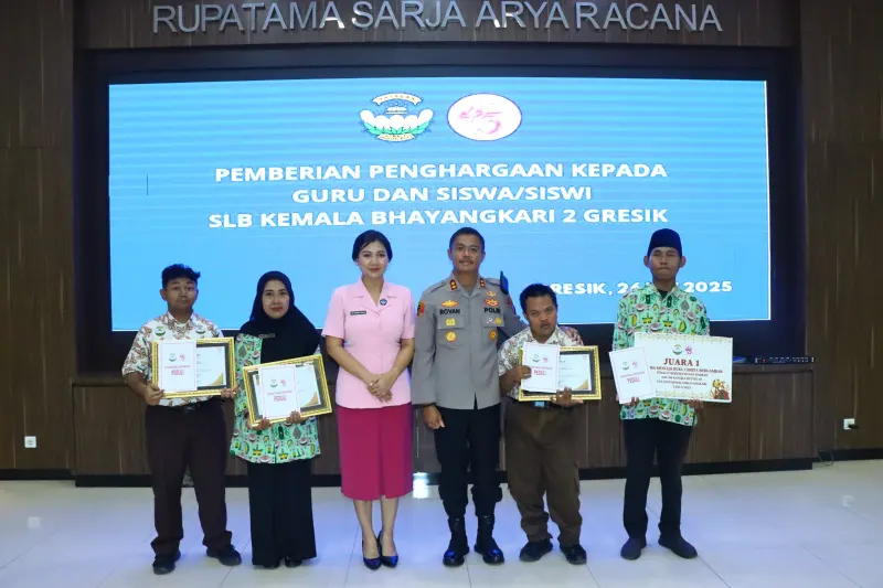 Semangat inklusi dan apresiasi mewarnai Aula Rupatama SAR Lt. III Polres Gresik pada Senin (26/5/2025), saat Kapolres Gresik AKBP Rovan Richard Mahenu menyerahkan piagam penghargaan kepada para guru dan siswa berprestasi dari SLB Kemala Bhayangkari 2 Gresik.