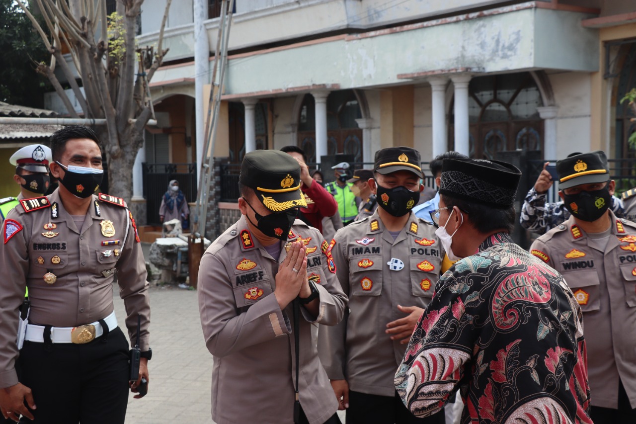Gresik – Kapolres Gresik AKBP Arief Fitrianto, SH., SIK., MM meninjau vaksinasi serentak pondok pesantren (Ponpes) dan rumah ibadah di Ponpes Metal, Desa Pongangan Manyar, Selasa (7/9/2021). Sebanyak 900 dosis vaksin disuntikkan dalam kesempatan tersebut.