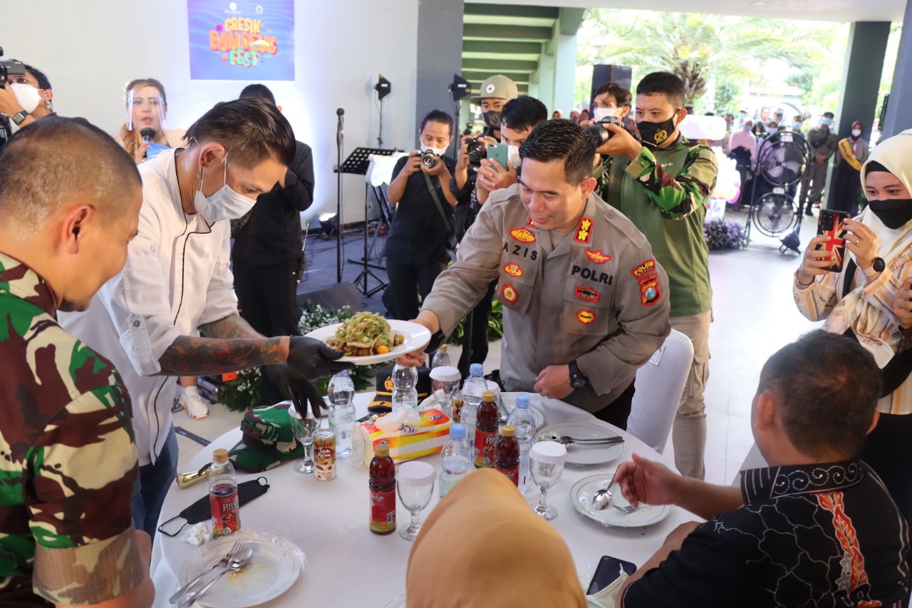 GRESIK – Kapolres Gresik AKBP Mochamad Nur Azis mencicipi masakan olahan bandeng dari Juna Rorimpandey atau Chef Juna. Kapolres mencicipi masakan dari juri acara perlombaan masak di salah satu tv swasta bersama jajaran Forkopimda.