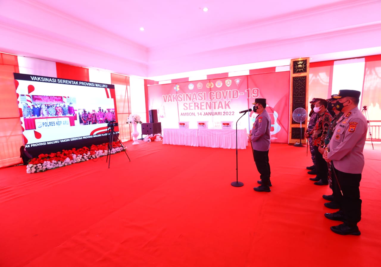 Maluku – Kapolri Jenderal Pol Drs Listyo Sigit Prabowo, M.Si., meninjau secara langsung kegiatan akselerasi vaksinasi massal di Provinsi Maluku dengan hadir secara langsung di Lapangan Merdeka Kota Ambon, Jumat (14/1/2022).