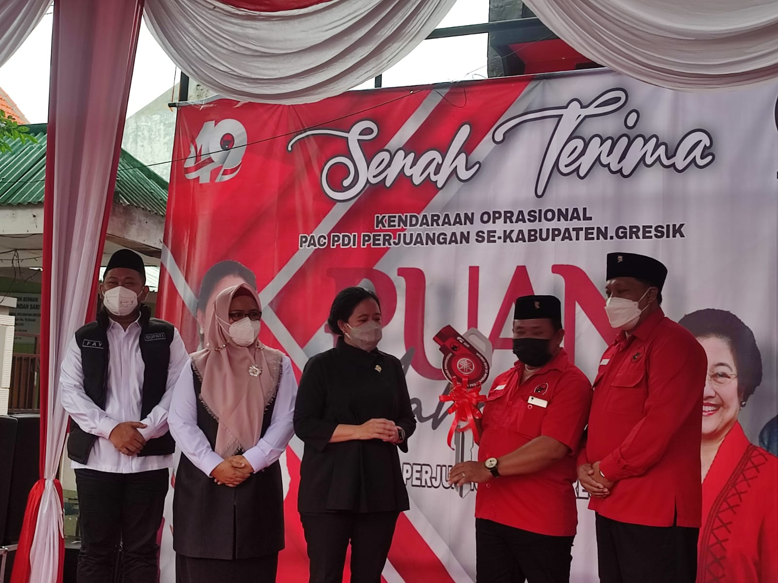 “Semoga selalu semangat,” kata Puan usai membagikan motor operasional di depan Kantor DPC PDI Perjuangan Gresik, Jalan Jaksa Agung Suprapto, Rabu (2/3/2022).