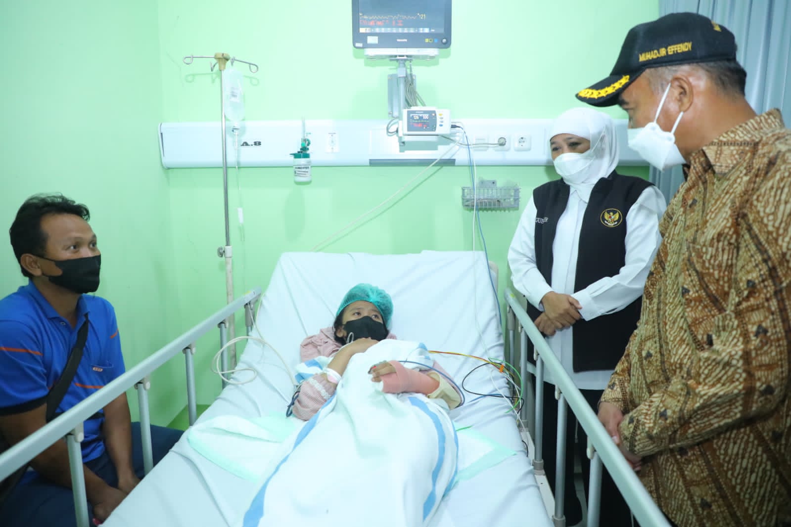 Setibanya di ruang rawat inap, Gubernur Khofifah menyampaikan rasa prihatin yang mendalam atas musibah yang terjadi. Kepada perwakilan keluarga, gubernur perempuan pertama di Jatim itu memberi penguatan kepada keluarga yang mendampingi korban agar tetap tenang dan sabar.