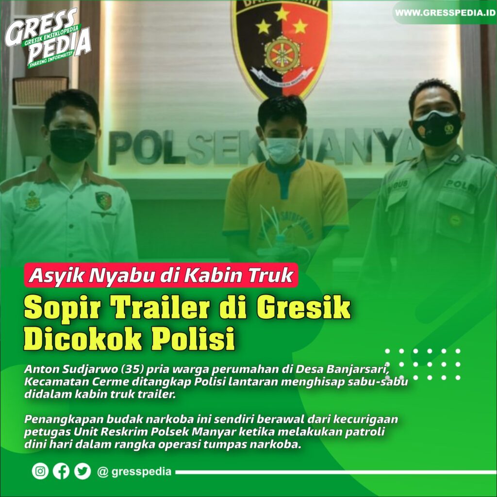 Gresik – Anton Sudjarwo (35) pria warga perumahan di Desa Banjarsari, Kecamatan Cerme ditangkap Polisi lantaran menghisap sabu-sabu didalam kabin truk trailer.