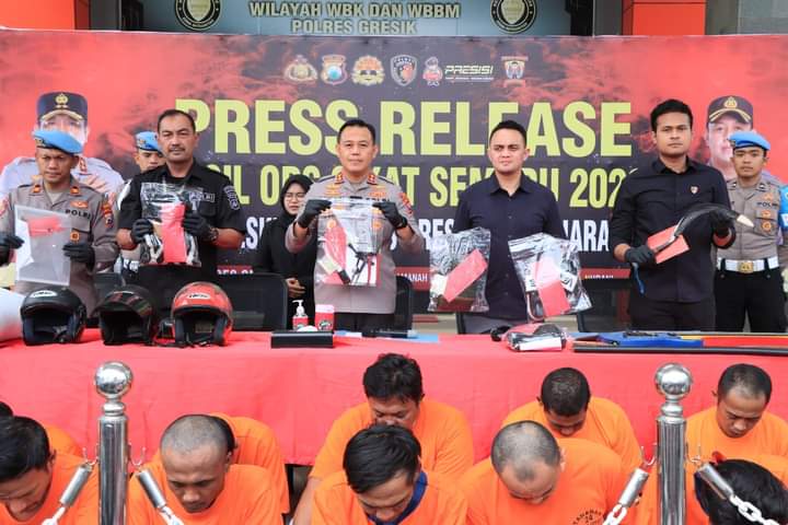 Polres Gresik dalam Konferensi press release Operasi Pekat Semeru 2023 hasil ungkap 3 C yakni Curanmor, Curas serta Curat yang dilakukan selama 12 hari bertempat di Mapolres Gresik, Selasa (30/05/2023). Sebanyak 21 tersangka pelaku kejahatan diamankan.