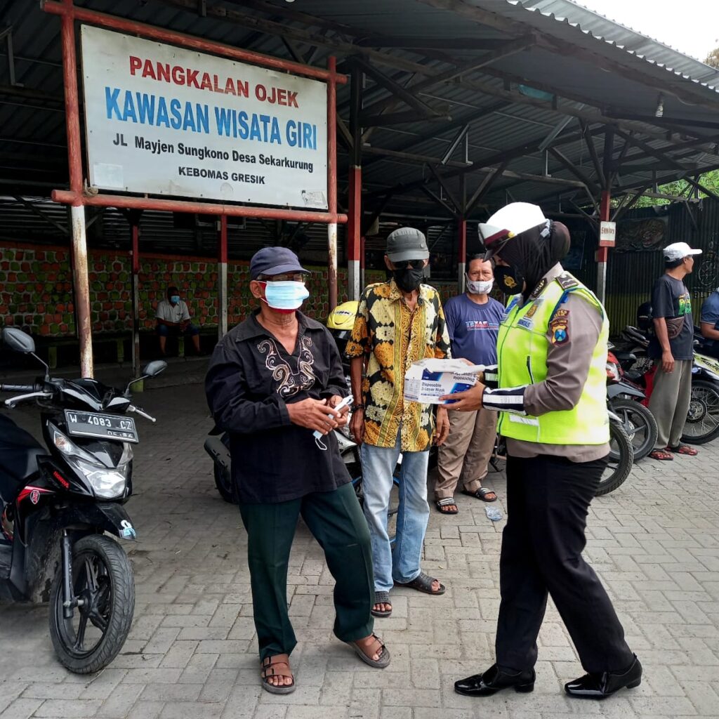Seperti dilakukan dalam operasi Patuh kali ini (25/9/2021). Anggota Satlantas Polres Gresik menggelar sosialisasi protokol kesehatan kepada pengendara. di Terminal Bunder dan Terminal Ojek Giri Sekaligus membagikan stiker imbauan dan masker kesehatan gratis.