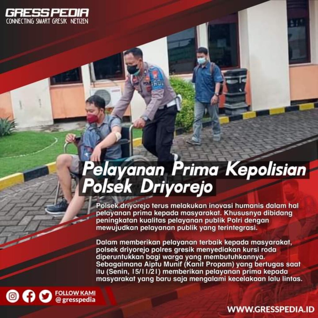 Dalam memberikan pelayanan terbaik kepada masyarakat, polsek driyorejo polres gresik menyediakan kursi roda diperuntukkan bagi warga yang membutuhkannya. Sebagaimana Aiptu Munif (Kanit Propam) yang bertugas saat itu (Senin, 15/11/21) memberikan pelayanan prima kepada masyarakat yang baru saja mengalami kecelakaan lalu lintas.