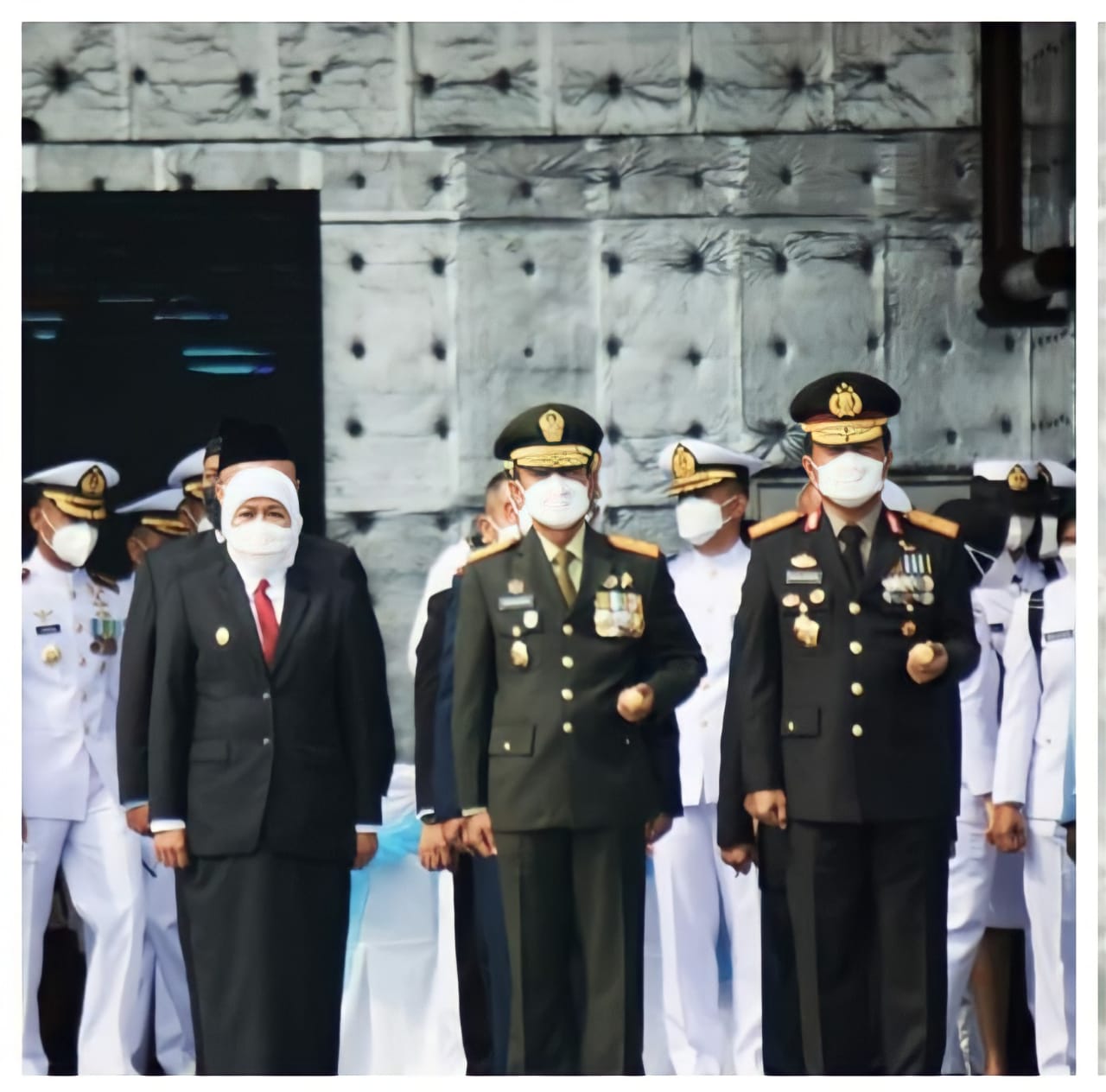 Surabaya – Forkopimda Jatim mengikuti pelaksanaan Upacara Tabur Bunga memperingati Hari Dharma Samudera di Hanggar Heli KRI dr.Wahidin Sudirohusodo-991, pada Sabtu, (15/1/2022).