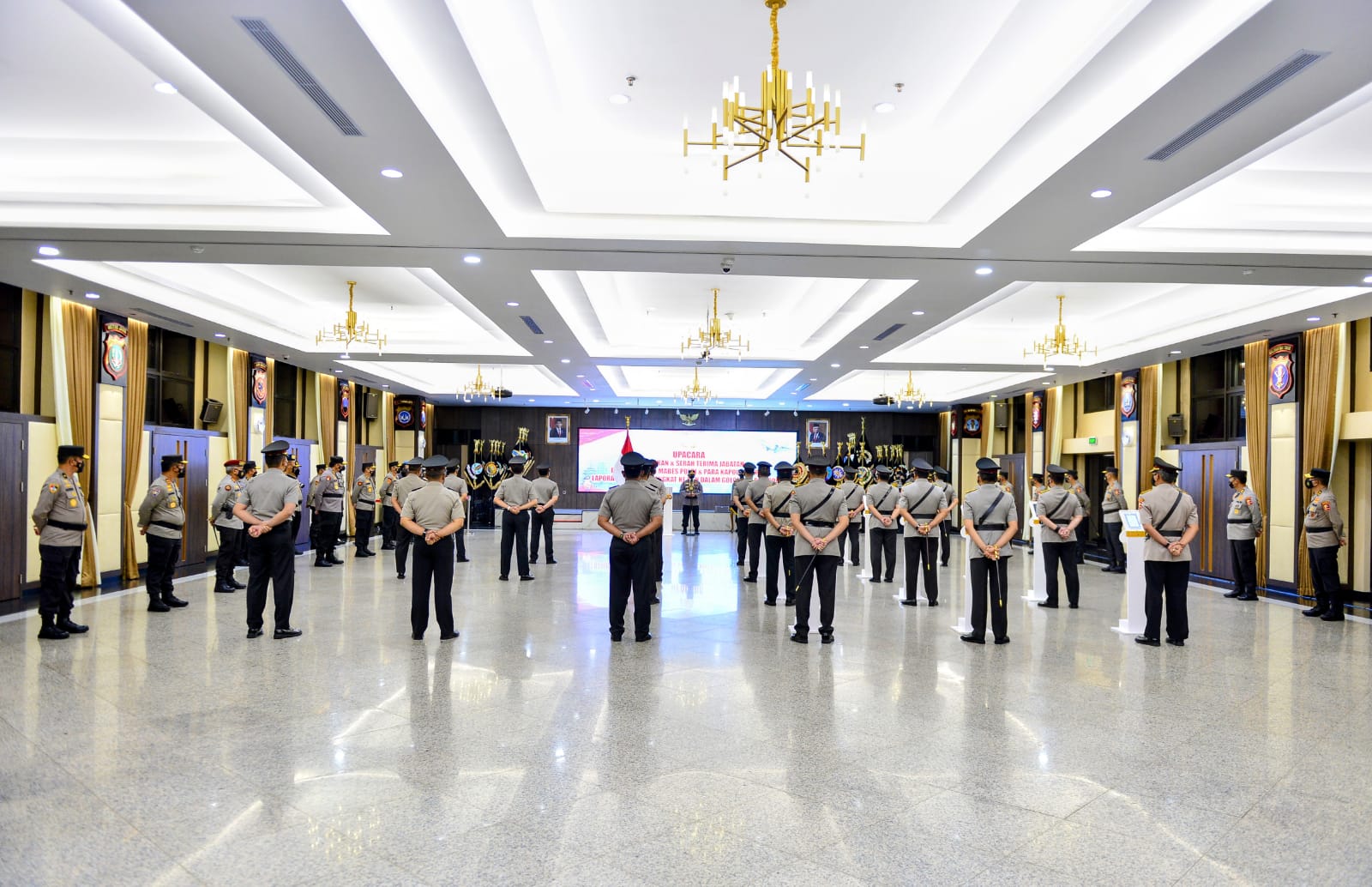Jakarta – Kapolri Jenderal Pol Drs Listyo Sigit Prabowo, M.Si., memimpin upacara serah terima jabatan (sertijab) sejumlah perwira tinggi (pati) Polri, yang diantaranya adalah, Kabaintelkam, Aslog Kapolri, Kakorlantas, Kadiv Humas Polri hingga enam Kapolda di Gedung Rupatama, Jakarta Selatan, Rabu (10/11/2021).