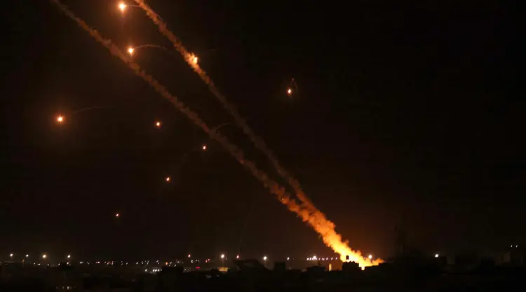 Di Tel Aviv Israel, orang-orang bergegas untuk berlindung ke tempat penampungan bom sebagai peringatan sirene tentang tembakan roket yang masuk menggelegar di seluruh kota, dan militer Israel meluncurkan sistem pertahanan udara “Iron Dome” untuk mencegat roket Hamas.