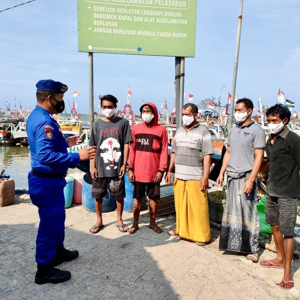 GRESIK – Polisi dari Satpolairud Polres Gresik datang ke Dermaga di Desa Campurejo, Kecamatan Panceng. Polisi bersama nelayan duduk bersama, sosialiasi larangan penggunaan trawl.