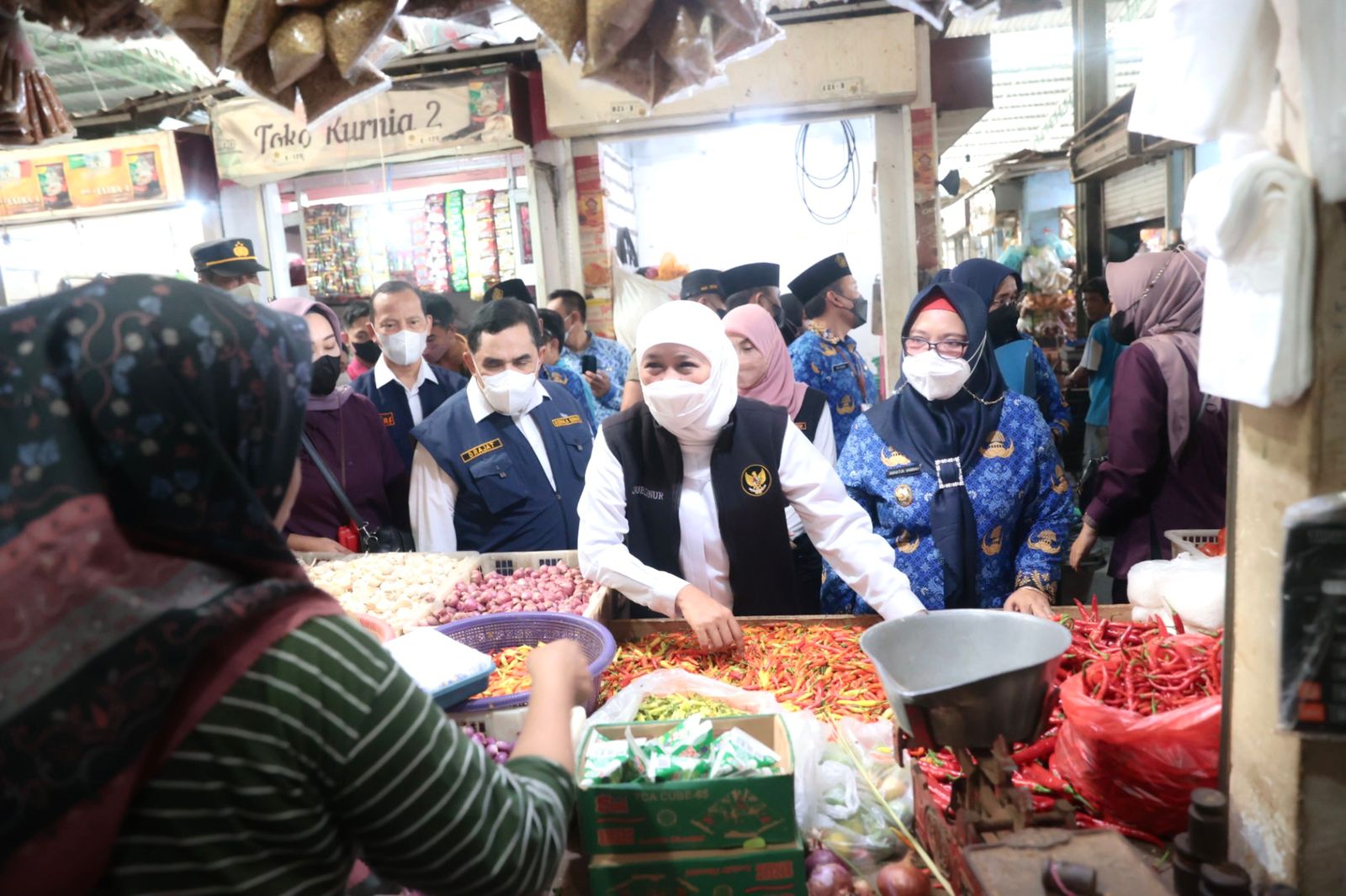 Bersama Kepala Dinas Perindag Jatim, beberapa Kepala OPD di lingkungan Pemprov Jatim dan juga Wakil Bupati Gresik, Gubernur Khofifah melakukan peninjauan harga bahan pokok yang ada di Pasar Baru.