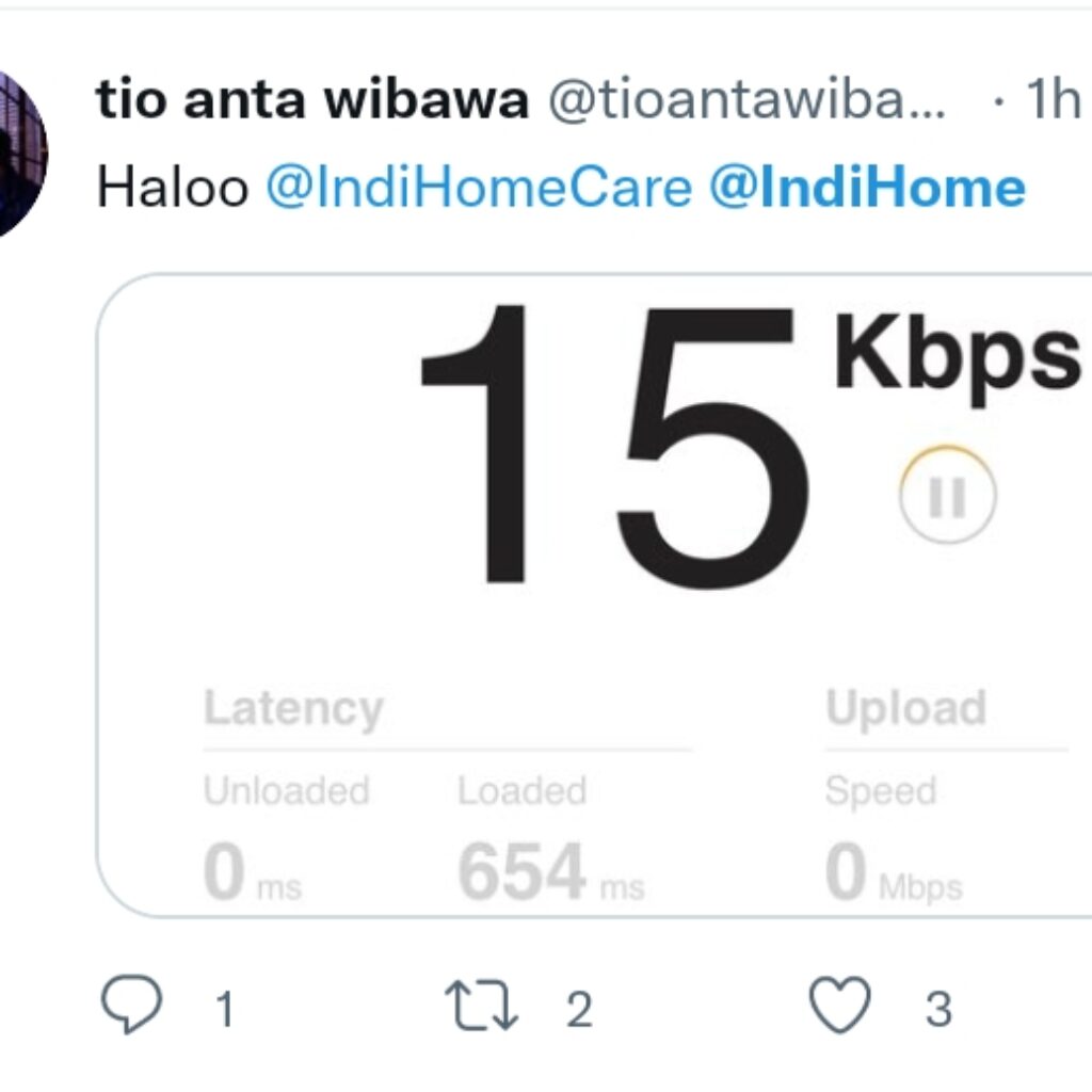 Dari pengamatan Gresspedia.id di lini masa Twitter, para pengguna mengeluhkan lambatnya koneksi internet. Salah satunya akun @tioantawibawa, ia mengunggah gambar kecepatan internet IndiHome 15 Kbps.