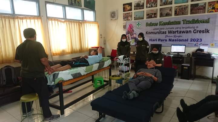 “Khusus hari ini, mereka para wartawan mengikuti serangkaian kegiatan pengobatan tradisional dengan tenaga kesehatan profesional dari Puskesmas Alun-alun Gresik,” katanya, Rabu (8/2/2023).